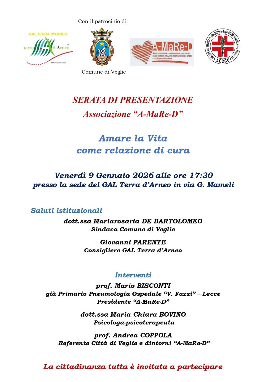 Presso la sede del GAL del Comune di Veglie (LE) si terrĂ VenerdĂŹ 9 Gennaio 2026 alle ore 17.30 una serata di incontro sul tema âAMARE LA VITA COME RELAZIONE DI CURAâ indetta e presentata dal nostro socio Dott. COPPOLA Andrea, referente sul territoriodi Veglie e dei paesi limitrofi, studioso di teologia ed Insegnante di religione. La serata di presentazione è patrocinata dal Comune di Veglie e dalla nostra Associazione A.MaRe.D, GAL TERRA DâARNEO, Ordine dei Medici Chirurghi e degli Odontoiatri della Provincia di Lecce. Parteciperanno quali relatori il Dott. BISCONTI Mario, PresidentedellâAssociazione, la Dott.ssa Maria Chiara BOVINO Psicologa-Psicoterapeuta, anchâessa socia A.MaRe.D.